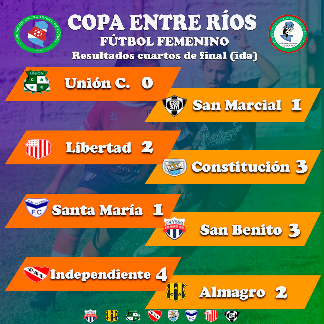 Ayer domingo en cancha de Victoria, en Concordia, San Benito como visitante derrotó 3 a 1 a Santa María de Oro en otro de los cruces de cuartos – partidos de ida – de la Copa Entre Ríos que organiza la FEF y se completó la jornada en Gualeguaychú con el triunfo de Independiente (Foto) 4 a 2 frente a Almagro de Concepción del Uruguay.